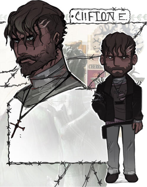 3 colored sketches of character ranging from fullbodies to headshots
