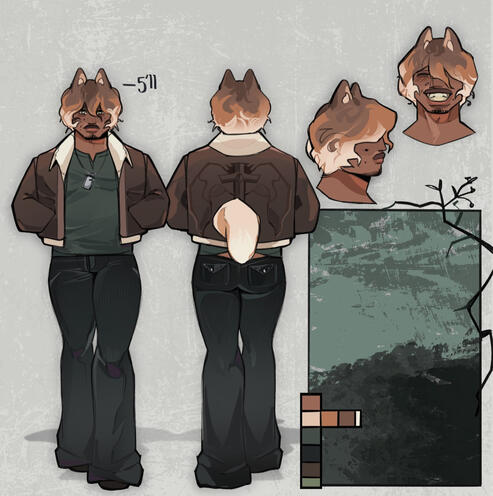A front and back view, two expressive headshots, and a color pallet collum